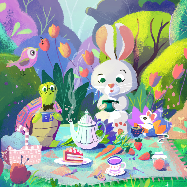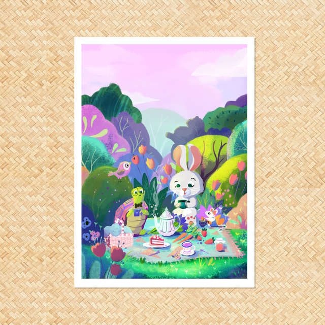 ️☀️ Une jolie illustration printanière avec des petits animaux qui prennent le thé . Idéal pour une chambre d'enfant.
